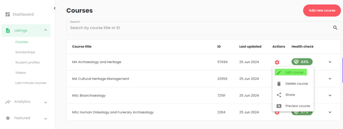 Once you have clicked into a department or found a course in the search, you will see a list of your programmes. To edit one, simple click into it or navigate to the gear icon and select 'edit course':